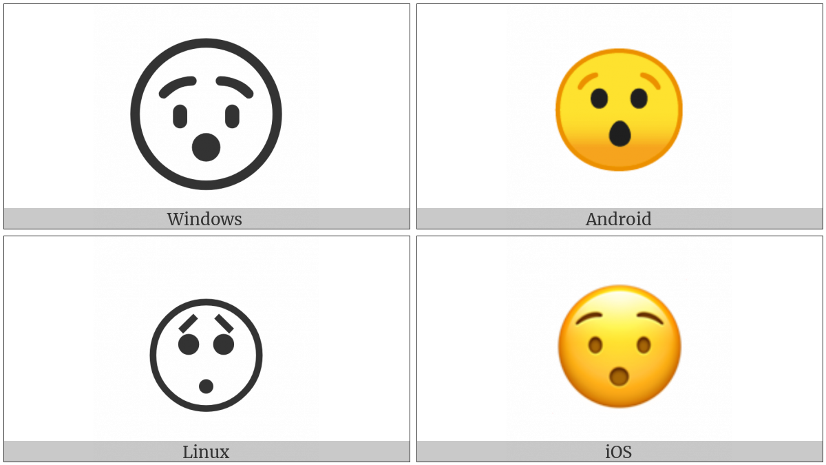 The image below shows how the “Hushed Face” symbol might look like on different operating systems. If the font in which this web site is displayed does not contain the symbol and there is no fallback font able to render it, you can use the image below to get an idea of what it should look like.