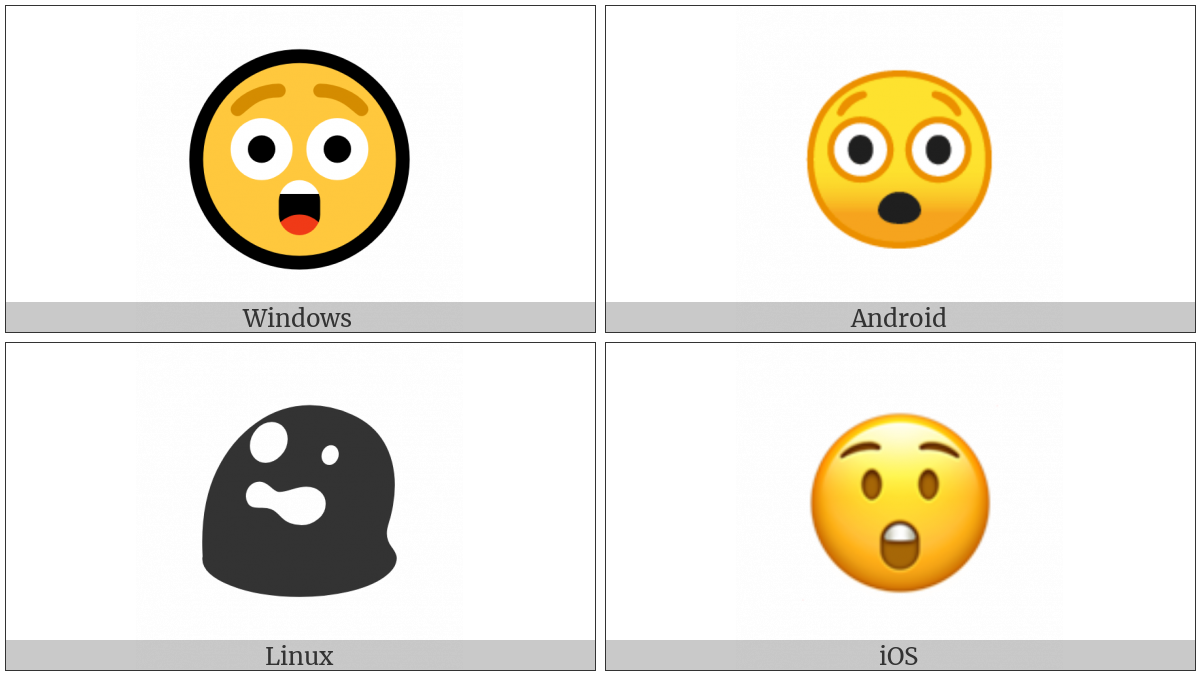 The image below shows how the “Astonished Face” symbol might look like on different operating systems. If the font in which this web site is displayed does not contain the symbol and there is no fallback font able to render it, you can use the image below to get an idea of what it should look like.