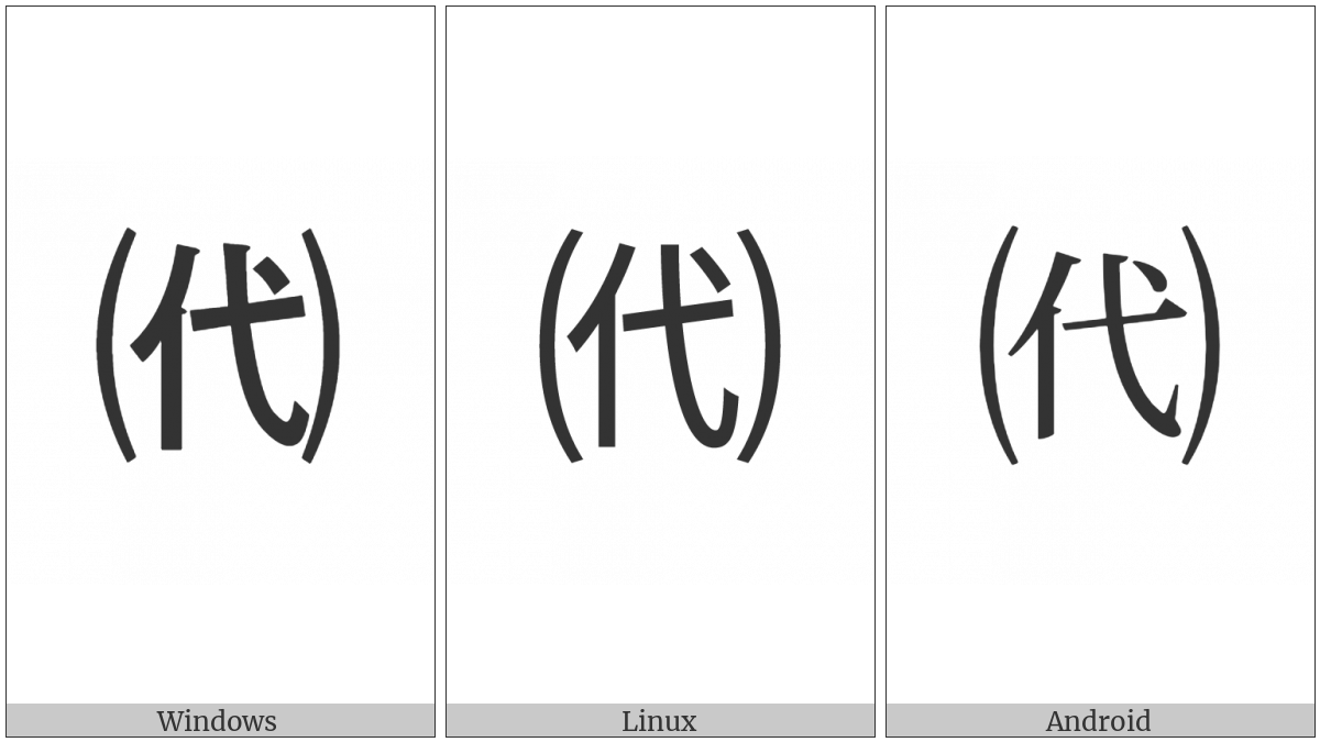 The image below shows how the “Parenthesized Ideograph Represent” symbol might look like on different operating systems. If the font in which this web site is displayed does not contain the symbol and there is no fallback font able to render it, you can use the image below to get an idea of what it should look like.
