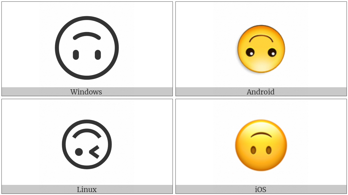 The image below shows how the “Upside-Down Face” symbol might look like on different operating systems. If the font in which this web site is displayed does not contain the symbol and there is no fallback font able to render it, you can use the image below to get an idea of what it should look like.