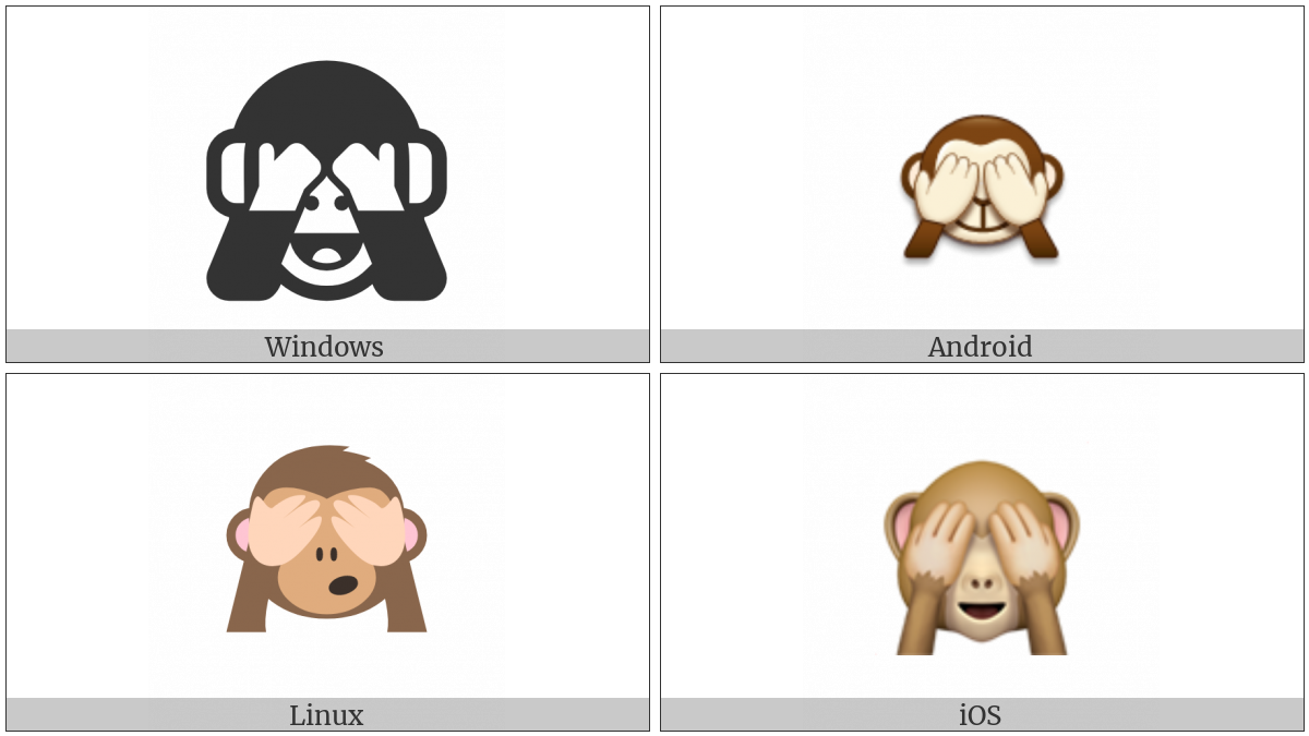 The image below shows how the “See-No-Evil Monkey” symbol might look like on different operating systems. If the font in which this web site is displayed does not contain the symbol and there is no fallback font able to render it, you can use the image below to get an idea of what it should look like.