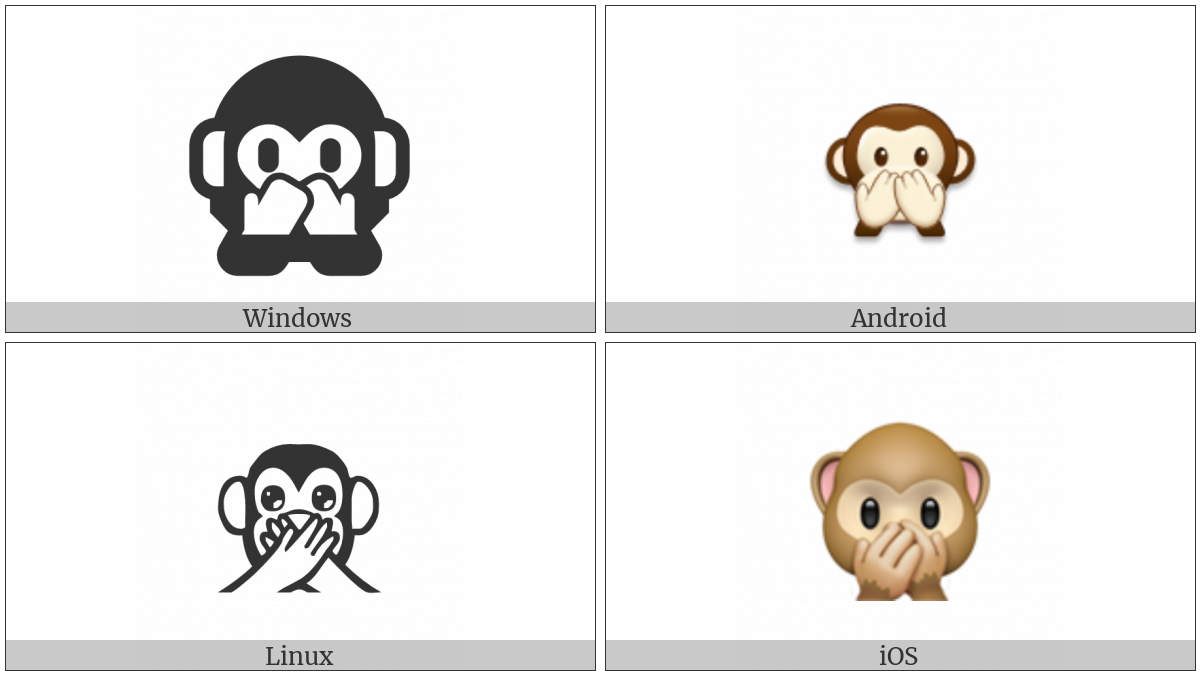 The image below shows how the “Speak-No-Evil Monkey” symbol might look like on different operating systems. If the font in which this web site is displayed does not contain the symbol and there is no fallback font able to render it, you can use the image below to get an idea of what it should look like.