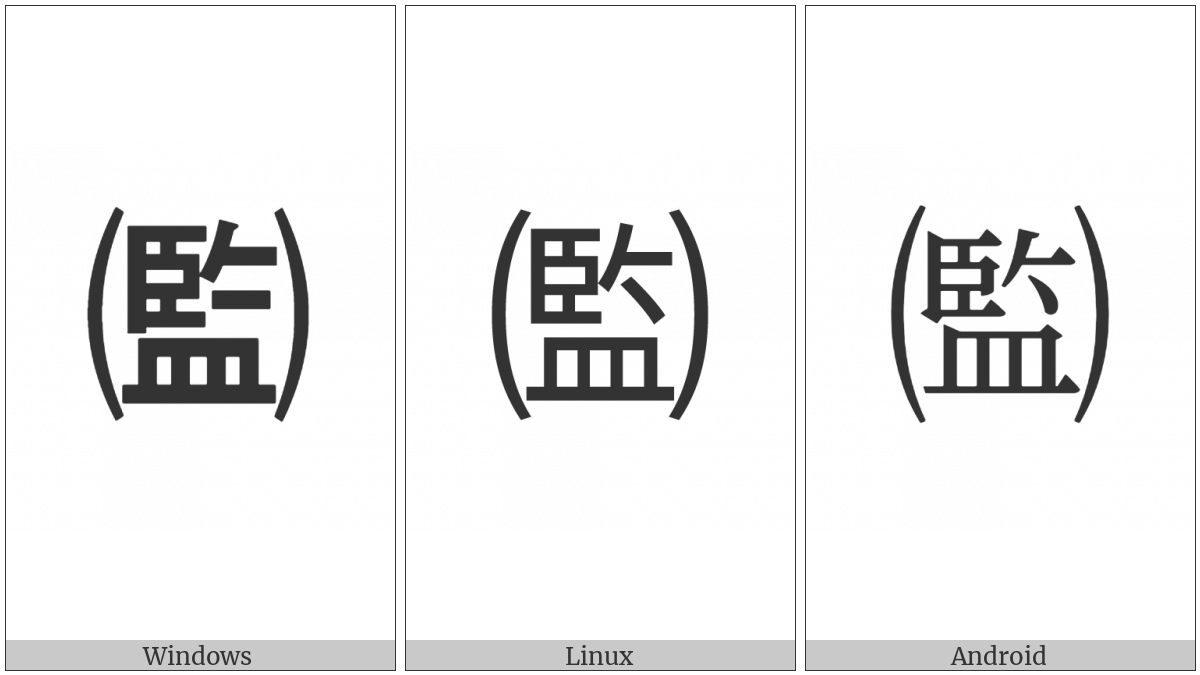 The image below shows how the “Parenthesized Ideograph Supervise” symbol might look like on different operating systems. If the font in which this web site is displayed does not contain the symbol and there is no fallback font able to render it, you can use the image below to get an idea of what it should look like.
