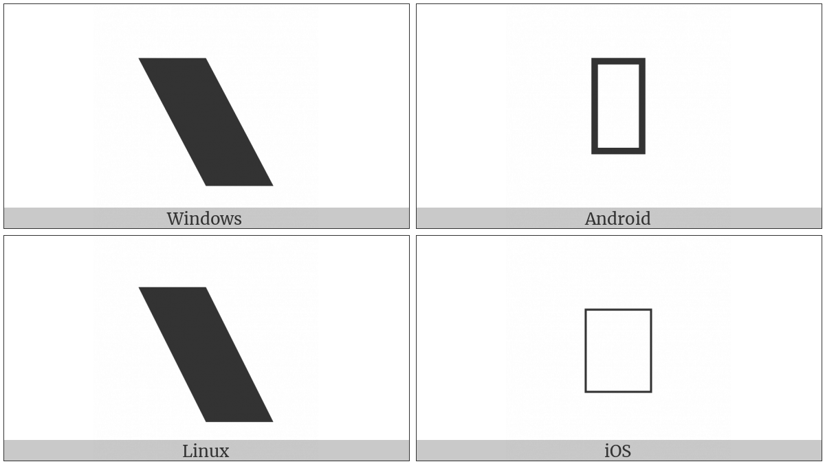 The image below shows how the “Very Heavy Reverse Solidus” symbol might look like on different operating systems. If the font in which this web site is displayed does not contain the symbol and there is no fallback font able to render it, you can use the image below to get an idea of what it should look like.