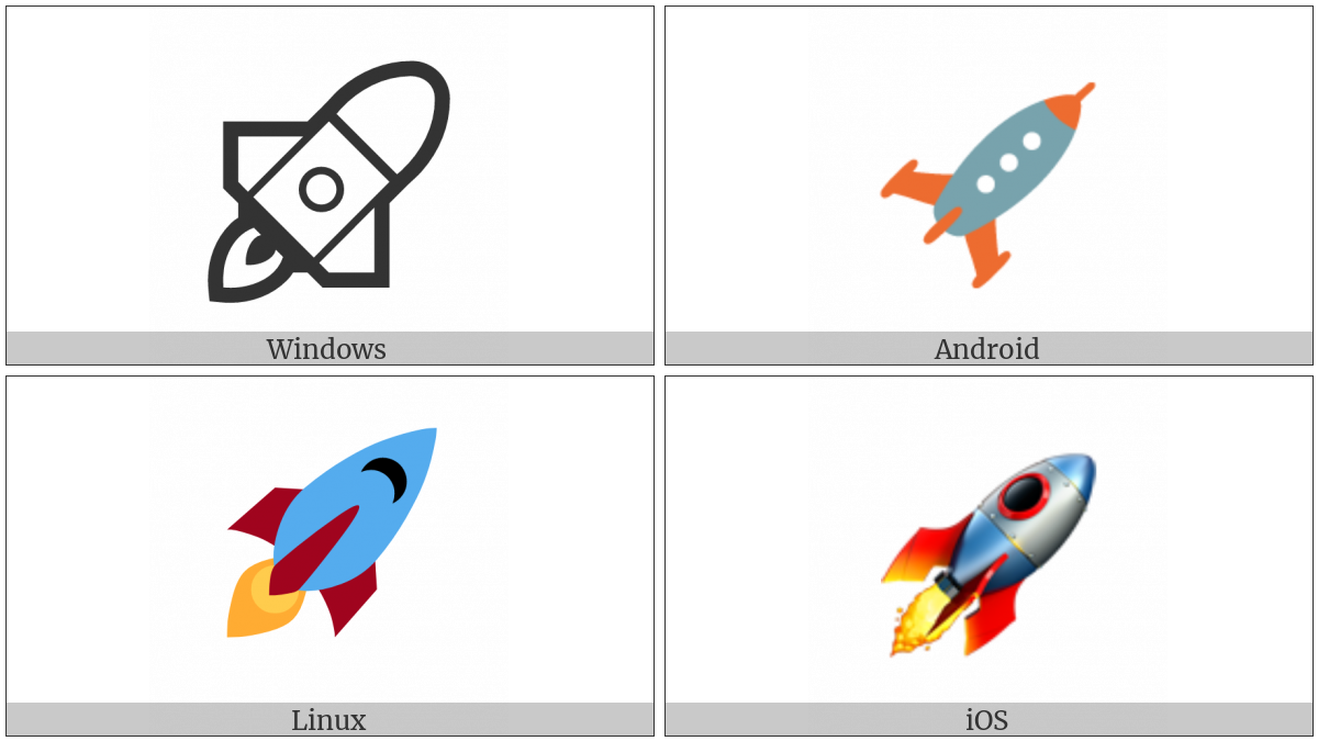 The image below shows how the “Rocket” symbol might look like on different operating systems. If the font in which this web site is displayed does not contain the symbol and there is no fallback font able to render it, you can use the image below to get an idea of what it should look like.