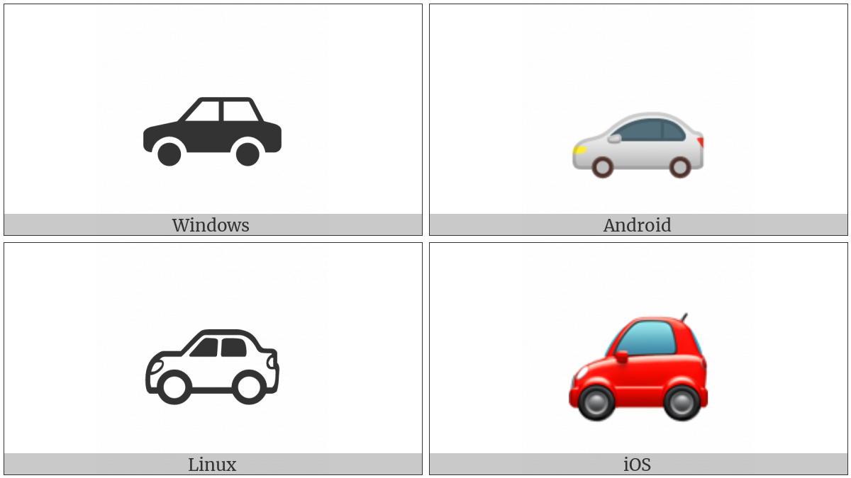 The image below shows how the “Automobile” symbol might look like on different operating systems. If the font in which this web site is displayed does not contain the symbol and there is no fallback font able to render it, you can use the image below to get an idea of what it should look like.