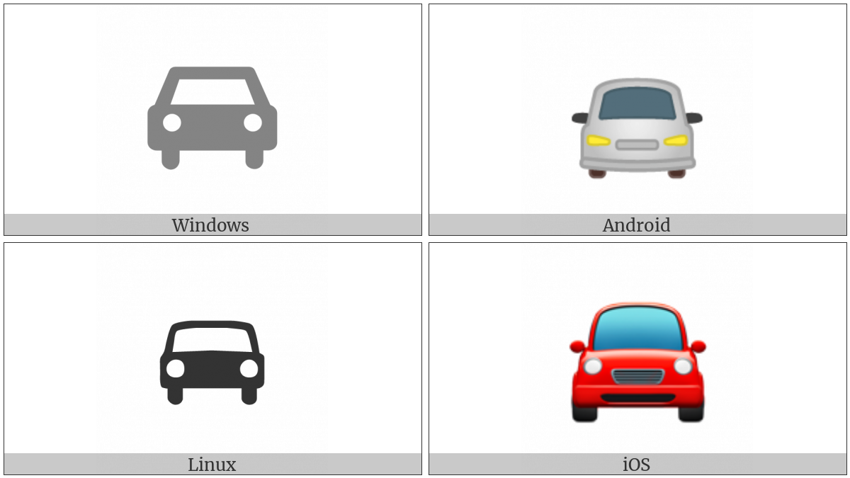 The image below shows how the “Oncoming Automobile” symbol might look like on different operating systems. If the font in which this web site is displayed does not contain the symbol and there is no fallback font able to render it, you can use the image below to get an idea of what it should look like.
