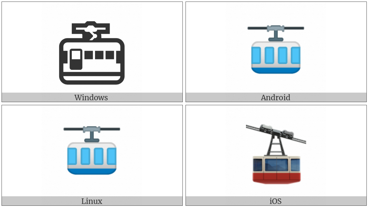 The image below shows how the “Mountain Cableway” symbol might look like on different operating systems. If the font in which this web site is displayed does not contain the symbol and there is no fallback font able to render it, you can use the image below to get an idea of what it should look like.