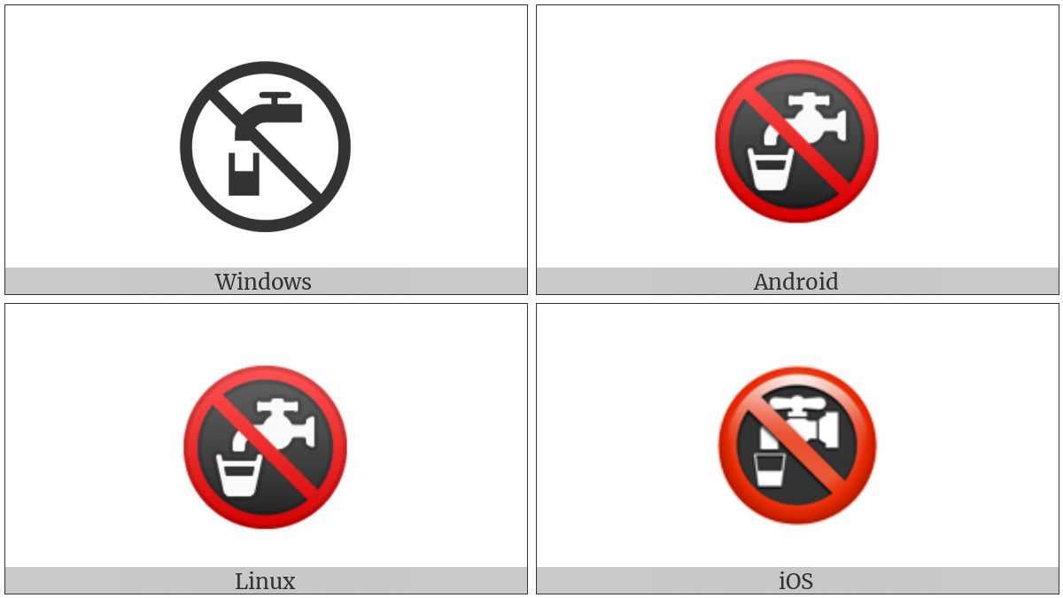 The image below shows how the “Non-Potable Water Symbol” symbol might look like on different operating systems. If the font in which this web site is displayed does not contain the symbol and there is no fallback font able to render it, you can use the image below to get an idea of what it should look like.