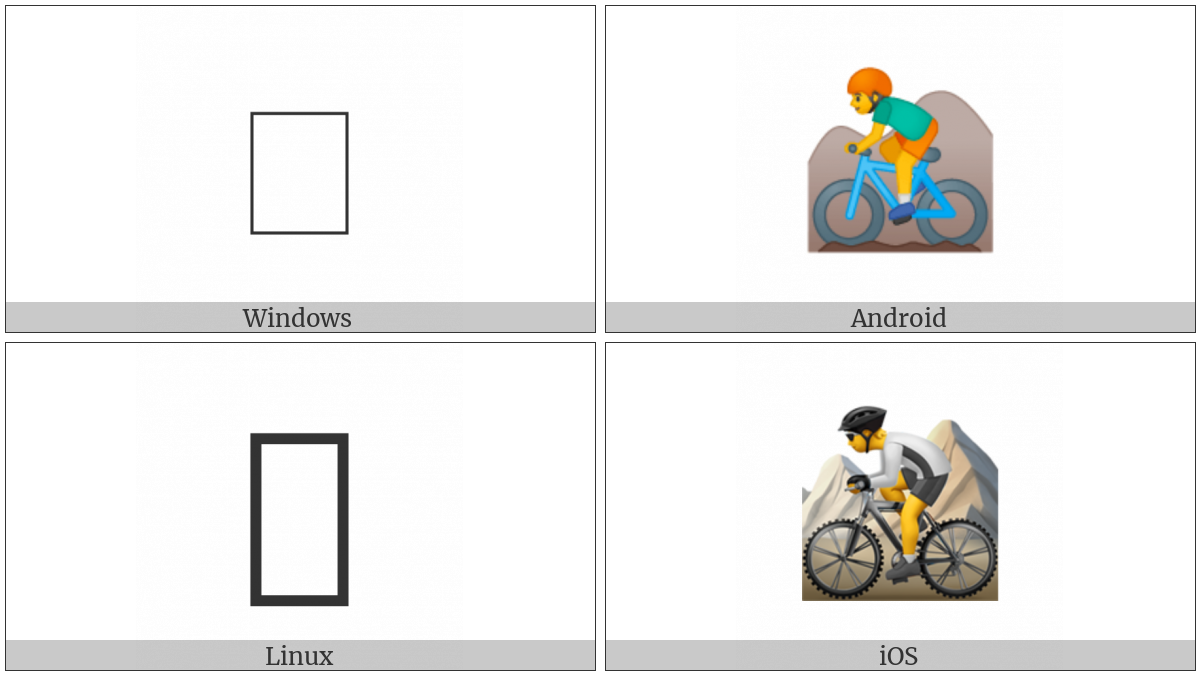 The image below shows how the “Mountain Bicyclist” symbol might look like on different operating systems. If the font in which this web site is displayed does not contain the symbol and there is no fallback font able to render it, you can use the image below to get an idea of what it should look like.