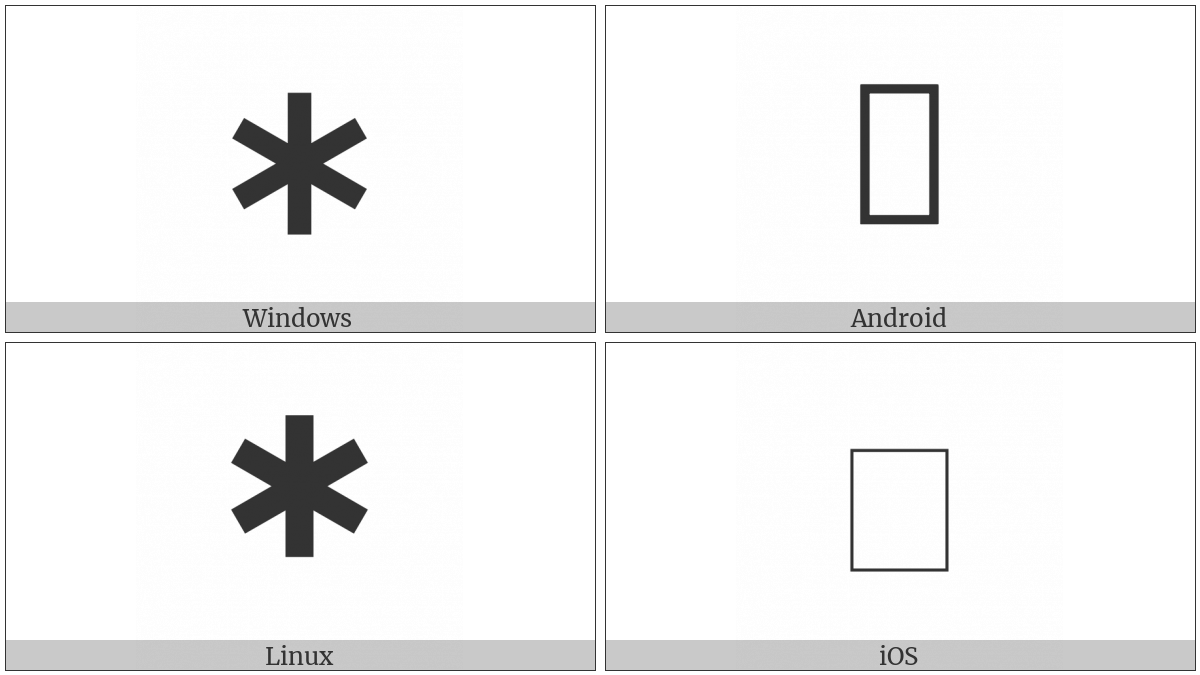 The image below shows how the “Heavy Six Spoked Asterisk” symbol might look like on different operating systems. If the font in which this web site is displayed does not contain the symbol and there is no fallback font able to render it, you can use the image below to get an idea of what it should look like.