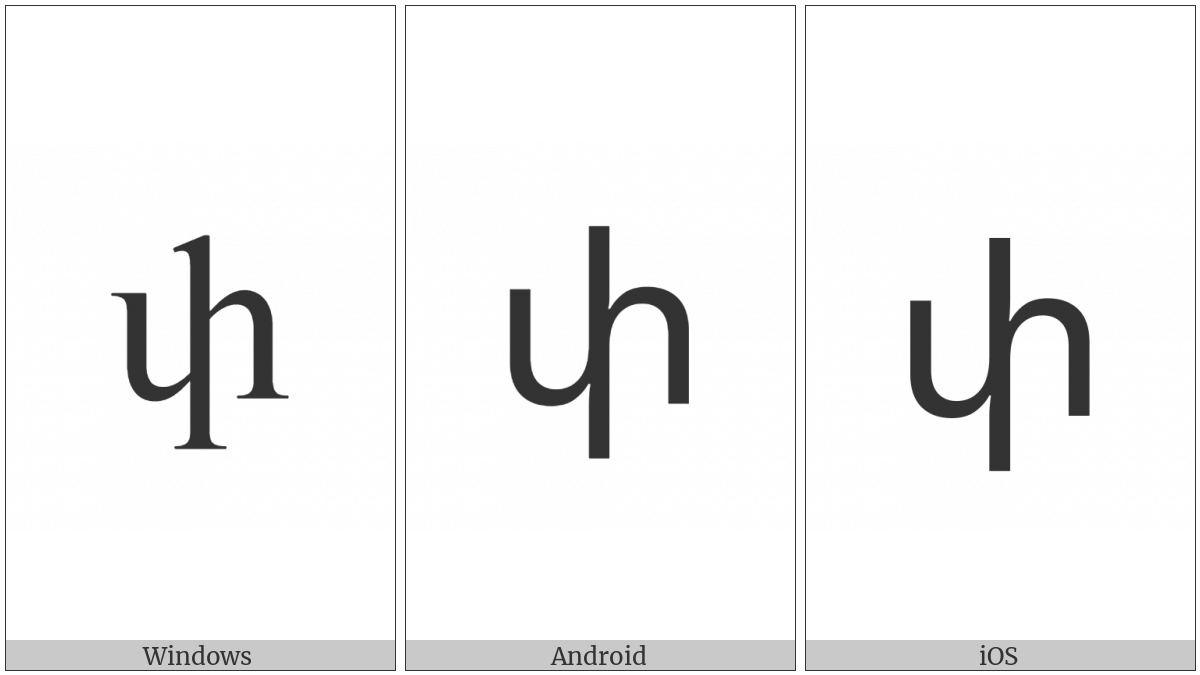 The image below shows how the “Armenian Small Letter Piwr” symbol might look like on different operating systems. If the font in which this web site is displayed does not contain the symbol and there is no fallback font able to render it, you can use the image below to get an idea of what it should look like.