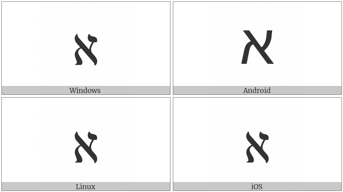 The image below shows how the “Hebrew Letter Alef” symbol might look like on different operating systems. If the font in which this web site is displayed does not contain the symbol and there is no fallback font able to render it, you can use the image below to get an idea of what it should look like.