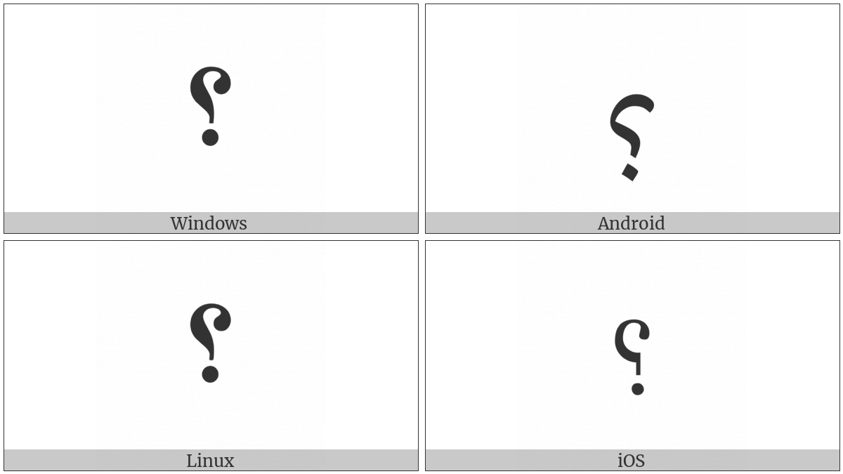 The image below shows how the “Arabic Question Mark” symbol might look like on different operating systems. If the font in which this web site is displayed does not contain the symbol and there is no fallback font able to render it, you can use the image below to get an idea of what it should look like.