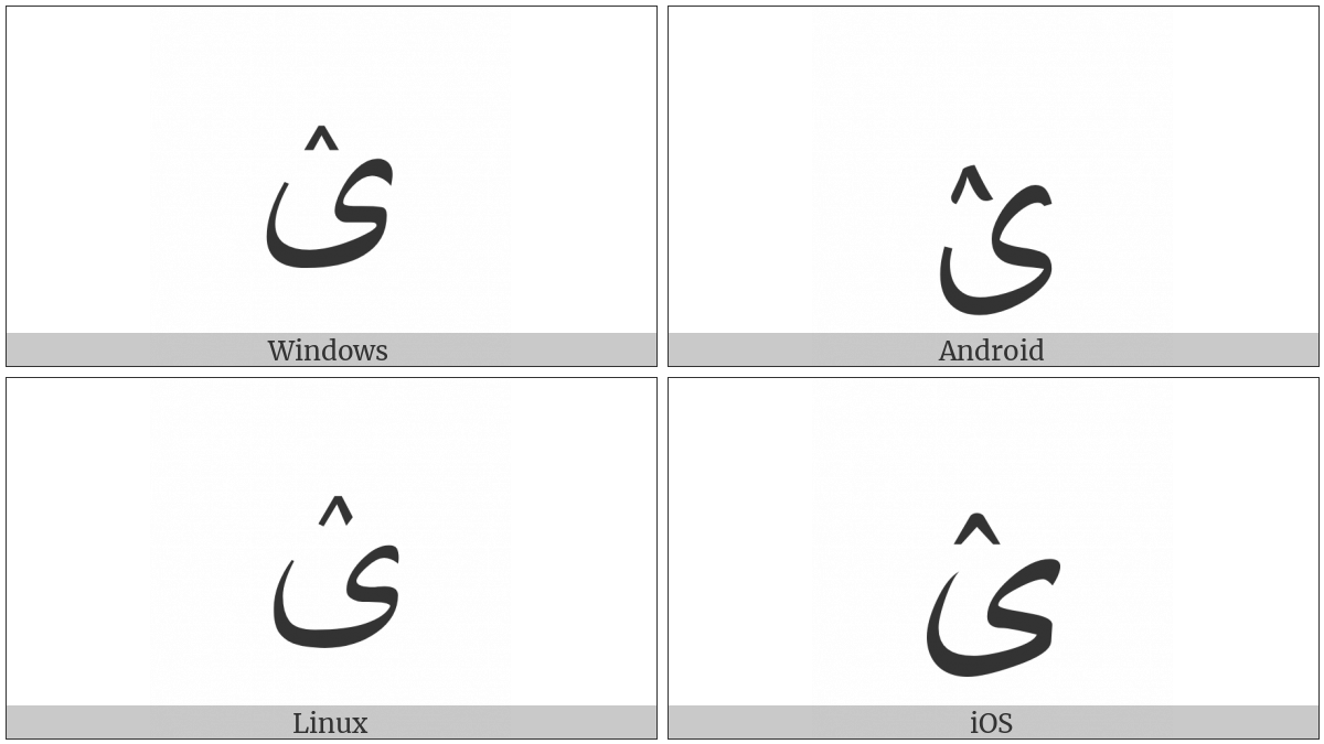 The image below shows how the “Arabic Letter Farsi Yeh With Inverted V” symbol might look like on different operating systems. If the font in which this web site is displayed does not contain the symbol and there is no fallback font able to render it, you can use the image below to get an idea of what it should look like.