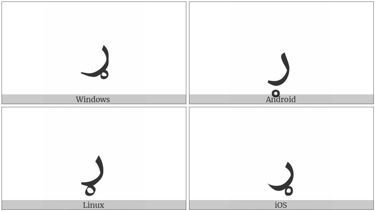 The image below shows how the “Arabic Letter Reh With Ring” symbol might look like on different operating systems. If the font in which this web site is displayed does not contain the symbol and there is no fallback font able to render it, you can use the image below to get an idea of what it should look like.