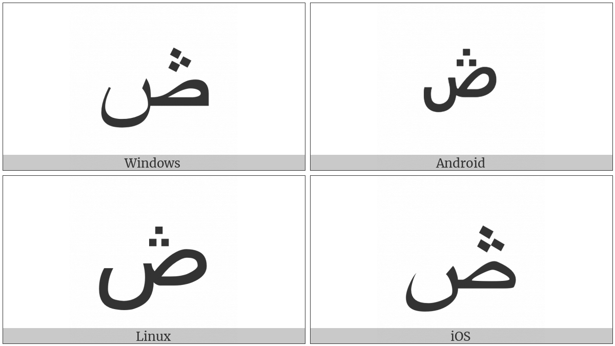 The image below shows how the “Arabic Letter Sad With Three Dots Above” symbol might look like on different operating systems. If the font in which this web site is displayed does not contain the symbol and there is no fallback font able to render it, you can use the image below to get an idea of what it should look like.