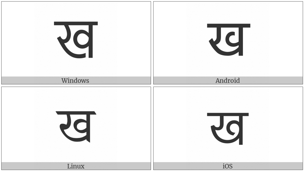 The image below shows how the “Devanagari Letter Kha” symbol might look like on different operating systems. If the font in which this web site is displayed does not contain the symbol and there is no fallback font able to render it, you can use the image below to get an idea of what it should look like.