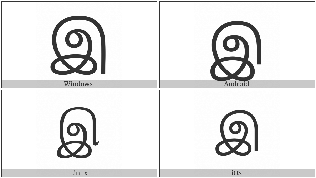 The image below shows how the “Tamil Letter I” symbol might look like on different operating systems. If the font in which this web site is displayed does not contain the symbol and there is no fallback font able to render it, you can use the image below to get an idea of what it should look like.