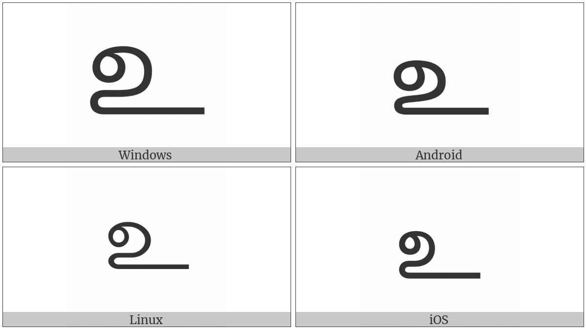 The image below shows how the “Tamil Letter U” symbol might look like on different operating systems. If the font in which this web site is displayed does not contain the symbol and there is no fallback font able to render it, you can use the image below to get an idea of what it should look like.