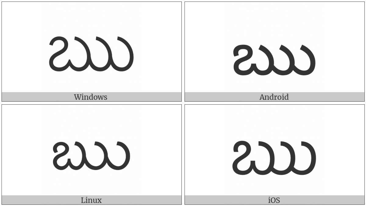 The image below shows how the “Telugu Letter Vocalic R” symbol might look like on different operating systems. If the font in which this web site is displayed does not contain the symbol and there is no fallback font able to render it, you can use the image below to get an idea of what it should look like.