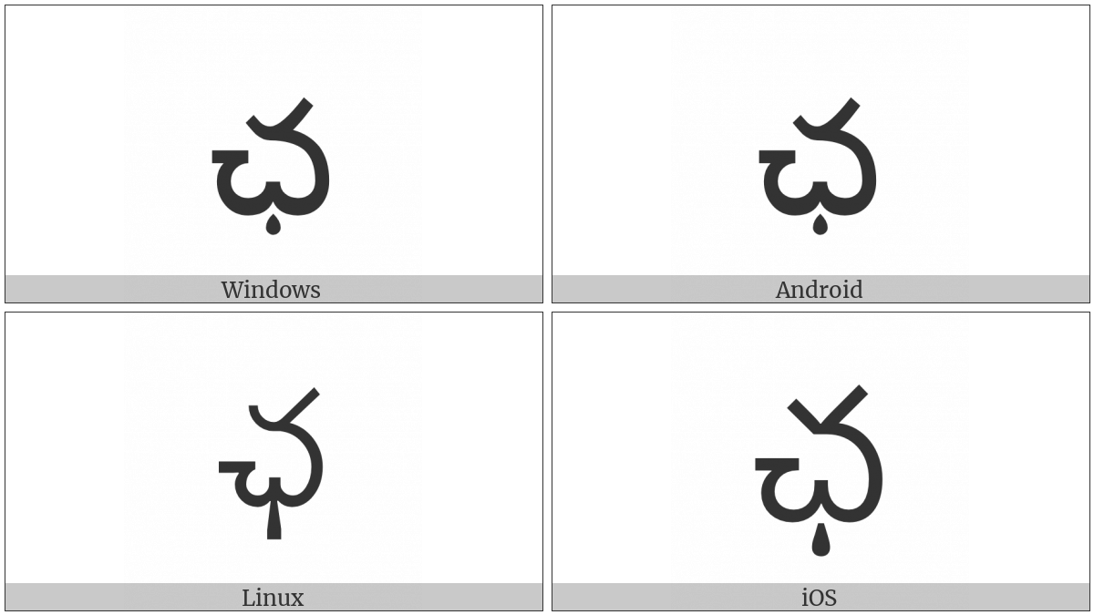The image below shows how the “Telugu Letter Cha” symbol might look like on different operating systems. If the font in which this web site is displayed does not contain the symbol and there is no fallback font able to render it, you can use the image below to get an idea of what it should look like.