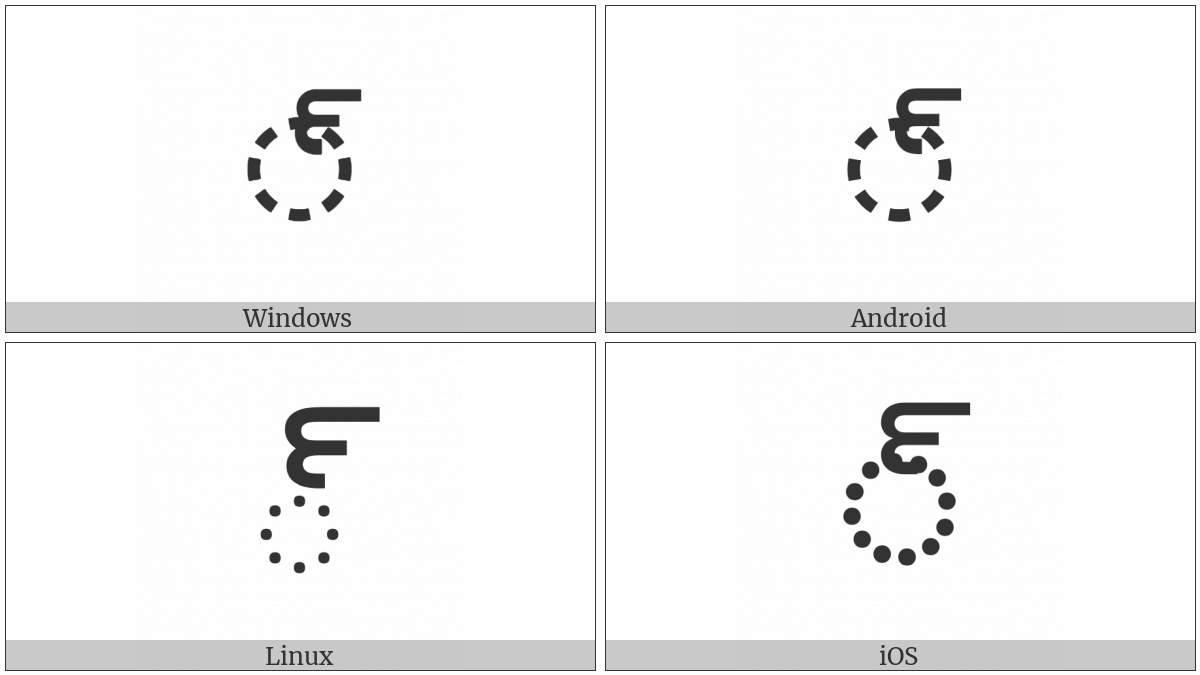 The image below shows how the “Telugu Sign Virama” symbol might look like on different operating systems. If the font in which this web site is displayed does not contain the symbol and there is no fallback font able to render it, you can use the image below to get an idea of what it should look like.