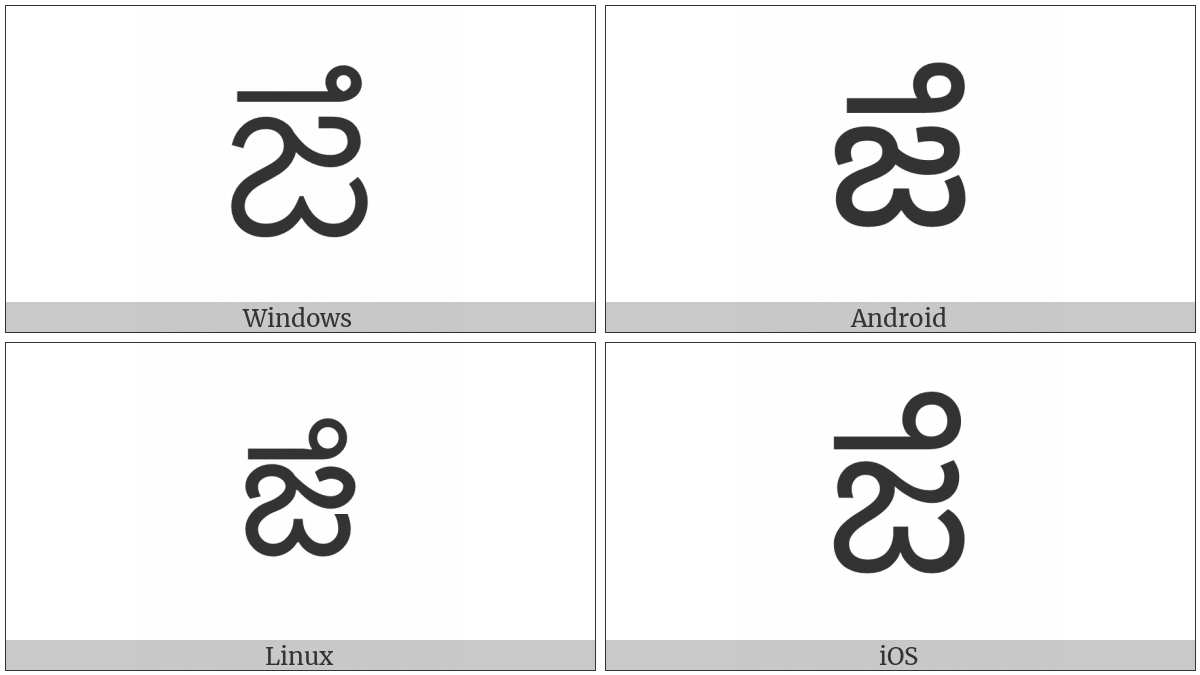 The image below shows how the “Telugu Letter Dza” symbol might look like on different operating systems. If the font in which this web site is displayed does not contain the symbol and there is no fallback font able to render it, you can use the image below to get an idea of what it should look like.