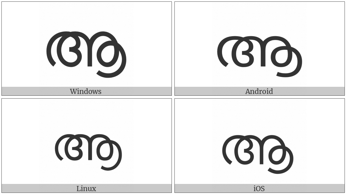 The image below shows how the “Malayalam Letter Aa” symbol might look like on different operating systems. If the font in which this web site is displayed does not contain the symbol and there is no fallback font able to render it, you can use the image below to get an idea of what it should look like.