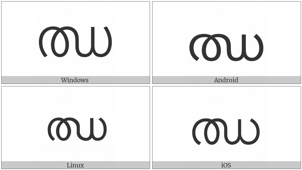 The image below shows how the “Malayalam Letter Jha” symbol might look like on different operating systems. If the font in which this web site is displayed does not contain the symbol and there is no fallback font able to render it, you can use the image below to get an idea of what it should look like.