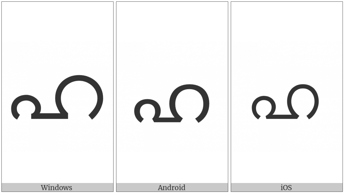 The image below shows how the “Malayalam Letter Ha” symbol might look like on different operating systems. If the font in which this web site is displayed does not contain the symbol and there is no fallback font able to render it, you can use the image below to get an idea of what it should look like.