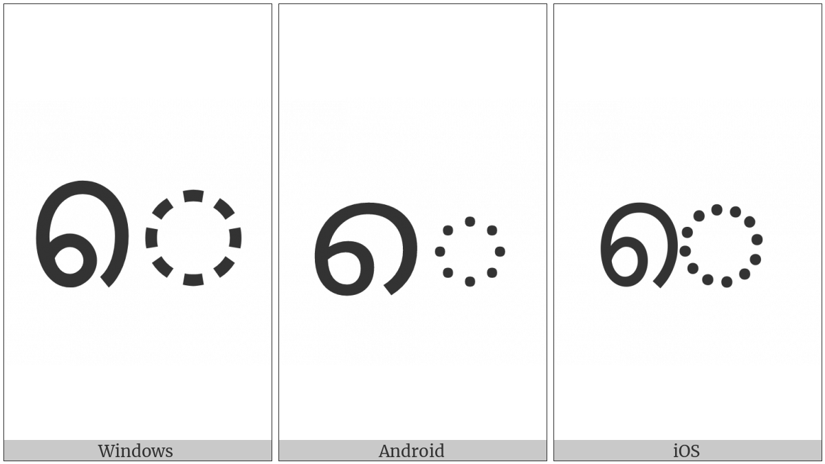 The image below shows how the “Malayalam Vowel Sign E” symbol might look like on different operating systems. If the font in which this web site is displayed does not contain the symbol and there is no fallback font able to render it, you can use the image below to get an idea of what it should look like.