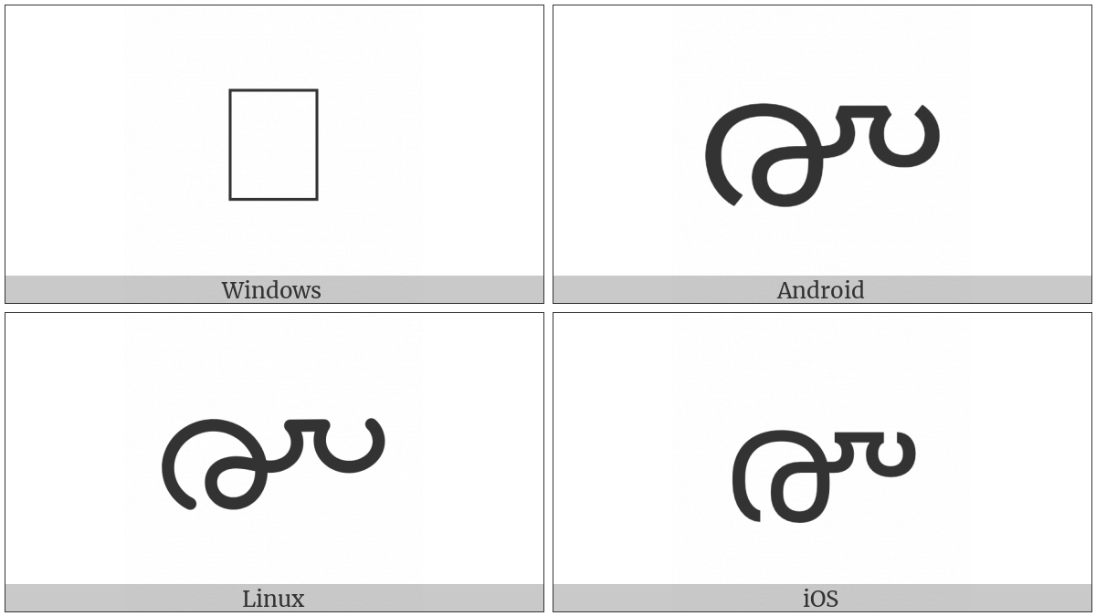 The image below shows how the “Malayalam Fraction One Fifth” symbol might look like on different operating systems. If the font in which this web site is displayed does not contain the symbol and there is no fallback font able to render it, you can use the image below to get an idea of what it should look like.