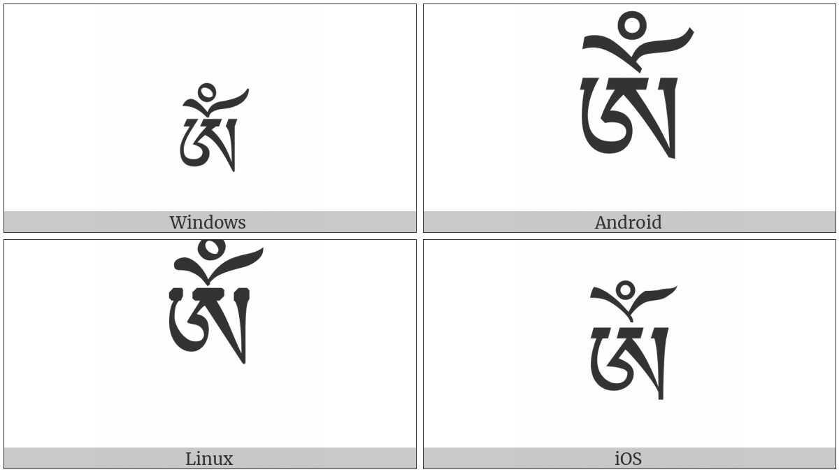 The image below shows how the “Tibetan Syllable Om” symbol might look like on different operating systems. If the font in which this web site is displayed does not contain the symbol and there is no fallback font able to render it, you can use the image below to get an idea of what it should look like.