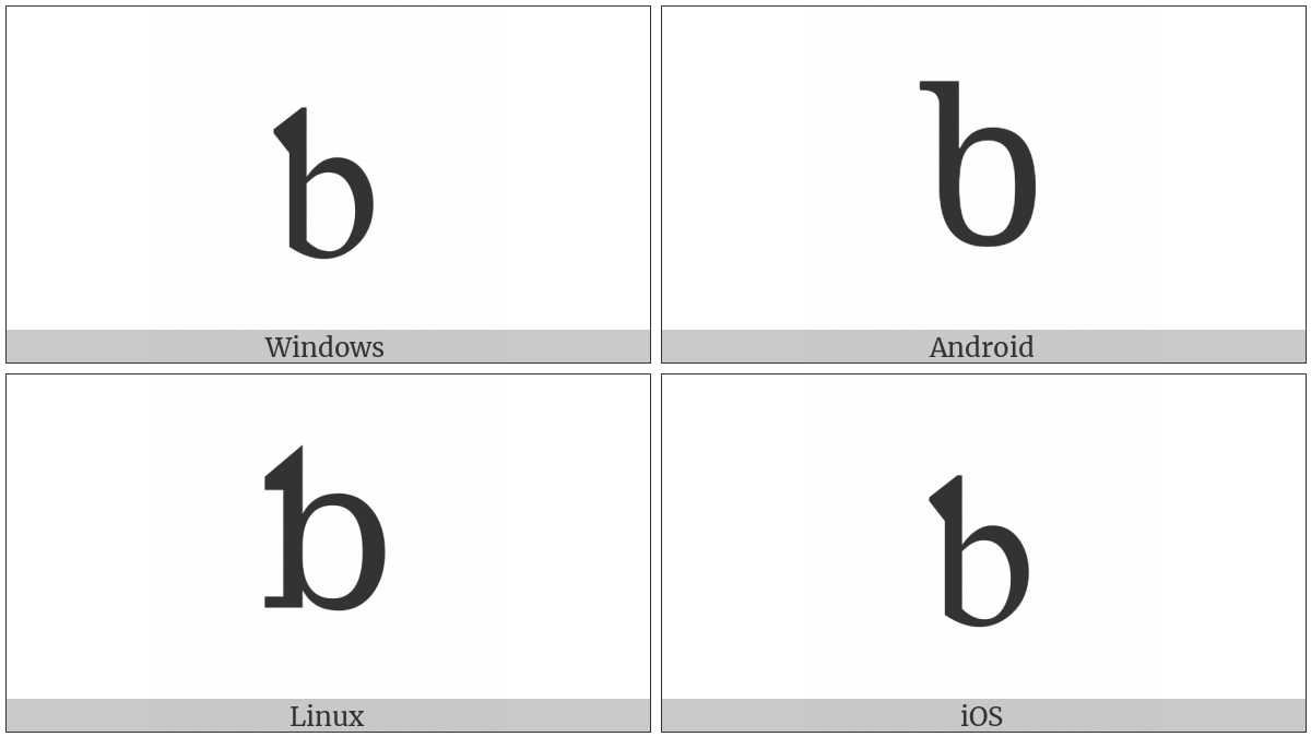 The image below shows how the “Latin Small Letter Tone Six” symbol might look like on different operating systems. If the font in which this web site is displayed does not contain the symbol and there is no fallback font able to render it, you can use the image below to get an idea of what it should look like.