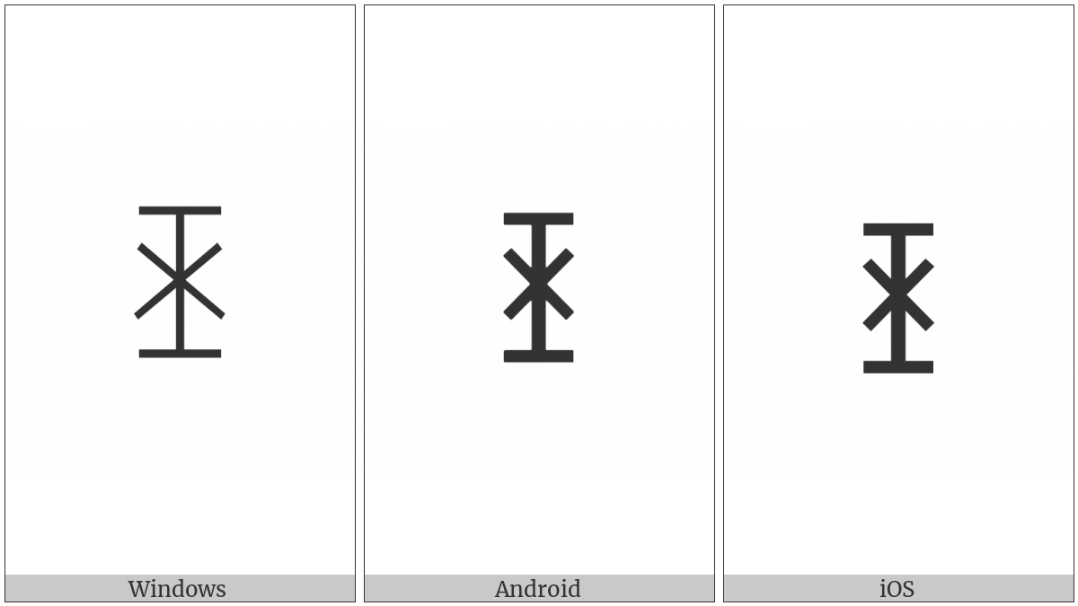The image below shows how the “Yi Syllable Bep” symbol might look like on different operating systems. If the font in which this web site is displayed does not contain the symbol and there is no fallback font able to render it, you can use the image below to get an idea of what it should look like.