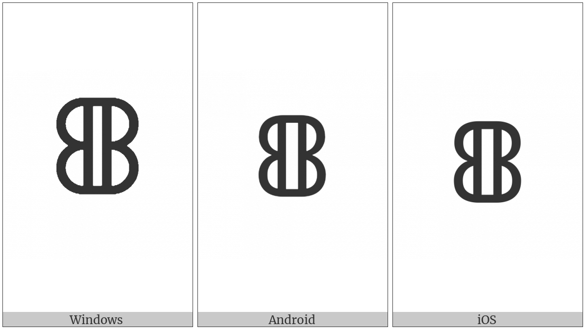The image below shows how the “Vai Syllable Ngga” symbol might look like on different operating systems. If the font in which this web site is displayed does not contain the symbol and there is no fallback font able to render it, you can use the image below to get an idea of what it should look like.