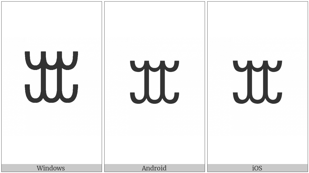 The image below shows how the “Vai Syllable Ga” symbol might look like on different operating systems. If the font in which this web site is displayed does not contain the symbol and there is no fallback font able to render it, you can use the image below to get an idea of what it should look like.