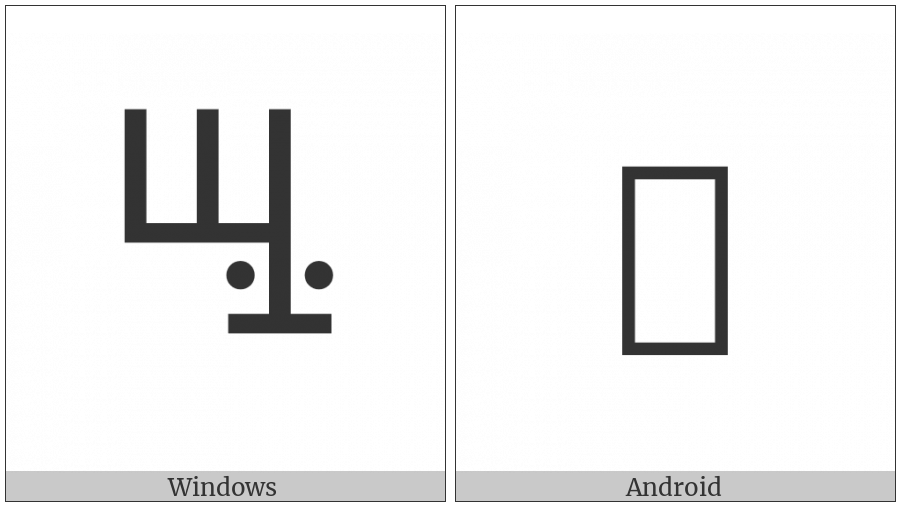 The image below shows how the “Vai Syllable Shoo” symbol might look like on different operating systems. If the font in which this web site is displayed does not contain the symbol and there is no fallback font able to render it, you can use the image below to get an idea of what it should look like.