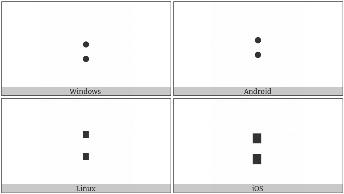 The image below shows how the “Modifier Letter Colon” symbol might look like on different operating systems. If the font in which this web site is displayed does not contain the symbol and there is no fallback font able to render it, you can use the image below to get an idea of what it should look like.