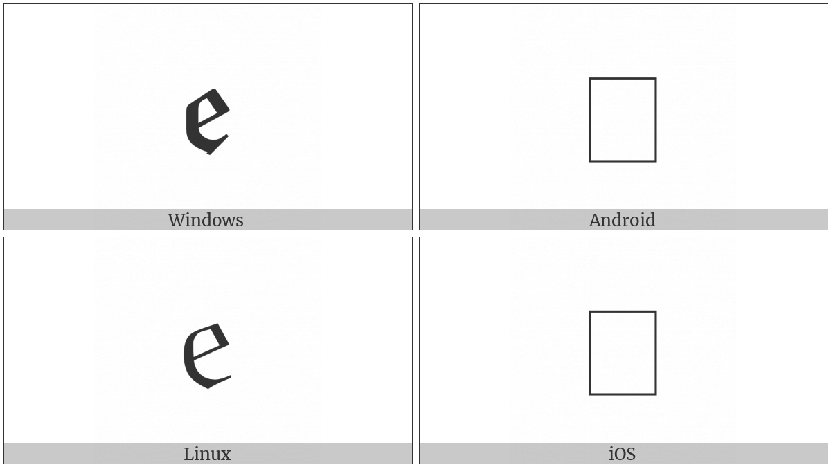 The image below shows how the “Latin Small Letter Blackletter E” symbol might look like on different operating systems. If the font in which this web site is displayed does not contain the symbol and there is no fallback font able to render it, you can use the image below to get an idea of what it should look like.