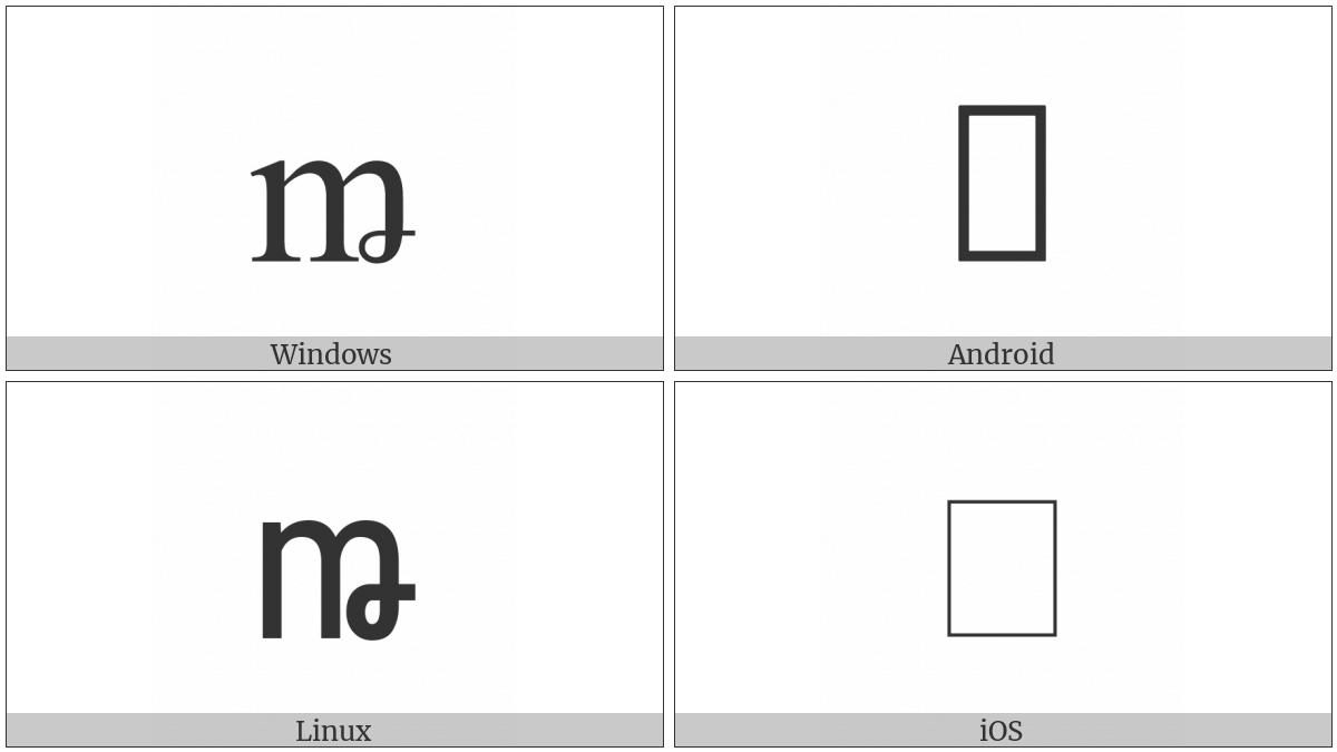 The image below shows how the “Latin Small Letter M With Crossed-Tail” symbol might look like on different operating systems. If the font in which this web site is displayed does not contain the symbol and there is no fallback font able to render it, you can use the image below to get an idea of what it should look like.