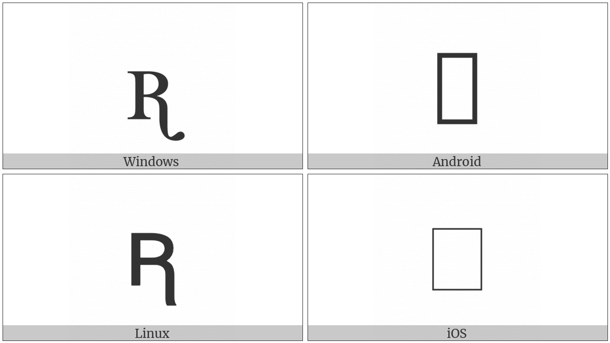 The image below shows how the “Latin Letter Small Capital R With Right Leg” symbol might look like on different operating systems. If the font in which this web site is displayed does not contain the symbol and there is no fallback font able to render it, you can use the image below to get an idea of what it should look like.