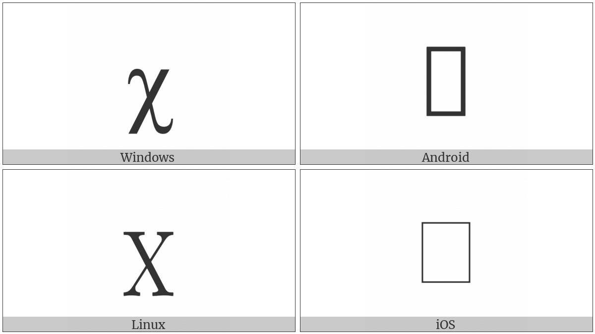 The image below shows how the “Latin Small Letter Chi” symbol might look like on different operating systems. If the font in which this web site is displayed does not contain the symbol and there is no fallback font able to render it, you can use the image below to get an idea of what it should look like.