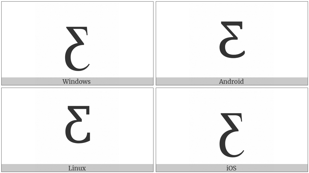 The image below shows how the “Latin Capital Letter Ezh Reversed” symbol might look like on different operating systems. If the font in which this web site is displayed does not contain the symbol and there is no fallback font able to render it, you can use the image below to get an idea of what it should look like.