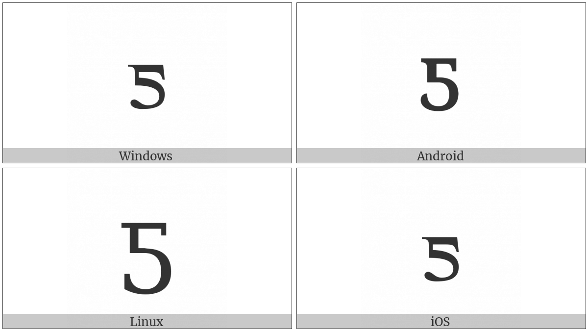 The image below shows how the “Latin Small Letter Tone Five” symbol might look like on different operating systems. If the font in which this web site is displayed does not contain the symbol and there is no fallback font able to render it, you can use the image below to get an idea of what it should look like.