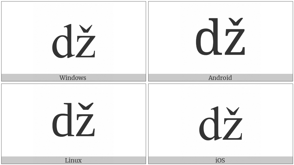 The image below shows how the “Latin Small Letter Dz With Caron” symbol might look like on different operating systems. If the font in which this web site is displayed does not contain the symbol and there is no fallback font able to render it, you can use the image below to get an idea of what it should look like.