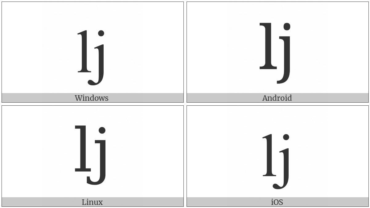 The image below shows how the “Latin Small Letter Lj” symbol might look like on different operating systems. If the font in which this web site is displayed does not contain the symbol and there is no fallback font able to render it, you can use the image below to get an idea of what it should look like.