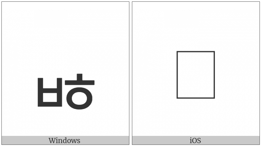 The image below shows how the “Hangul Jongseong Pieup-Hieuh” symbol might look like on different operating systems. If the font in which this web site is displayed does not contain the symbol and there is no fallback font able to render it, you can use the image below to get an idea of what it should look like.