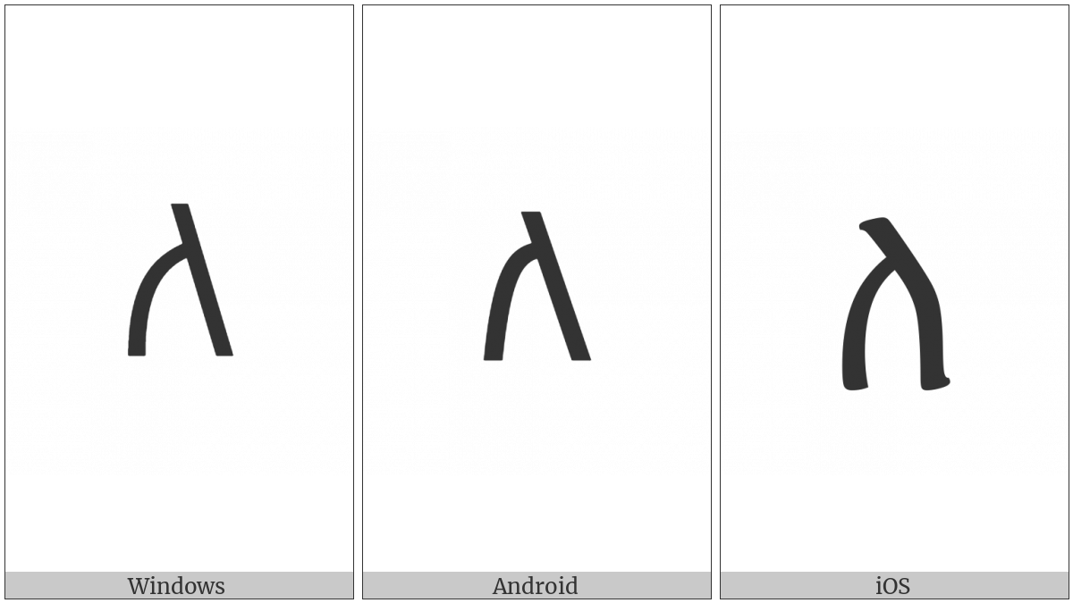 The image below shows how the “Ethiopic Syllable La” symbol might look like on different operating systems. If the font in which this web site is displayed does not contain the symbol and there is no fallback font able to render it, you can use the image below to get an idea of what it should look like.